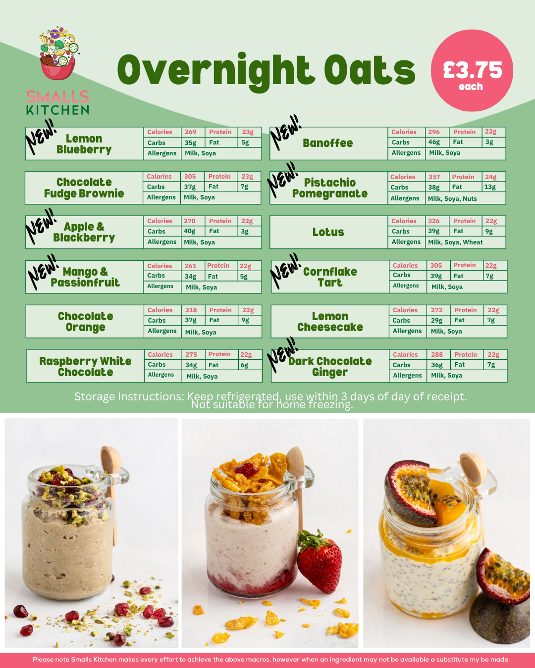 Revitalise your mornings with our protein-packed overnight oats, the perfect blend of nutrition and convenience. Crafted with premium ingredients and packed with essential proteins, our overnight oats are designed to fuel your day and keep you satisfied until lunch! Whether you're a busy professional on-the-go or a health-conscious individual seeking a delicious breakfast option, our protein-packed oats are the ideal choice. With different flavour combinations to choose from every week you’re not going to get bored.